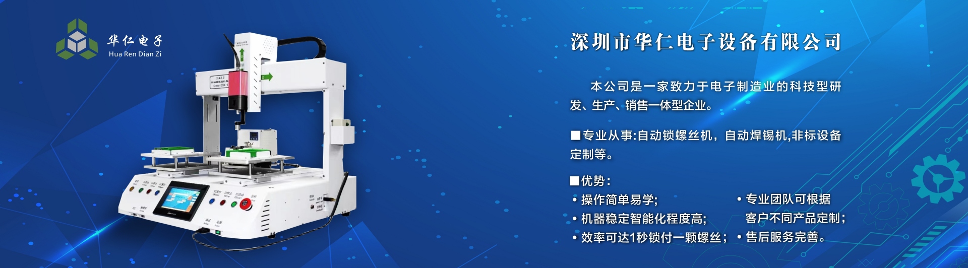深圳市華仁電子設備有限公司是一家致力于電子制造業周邊設備的科技型研發、生產、銷售一體的企業,專業從事:自動鎖螺絲機;自動焊錫機;非標設備定制機等,公司長期以來在行業中積累了豐富的經驗,擁有專業的研發、技術、銷售支持工程團隊、各高級技術人才為客戶提供優質產品和服務,同時不斷吸取國內外先進技術,更準確及時地為客戶提供優質,性價比高的產品、公司以專業的售前、售中、售后服務贏得了客戶的信賴和好評,為客戶提供先進自動化設備一體式解決方案、